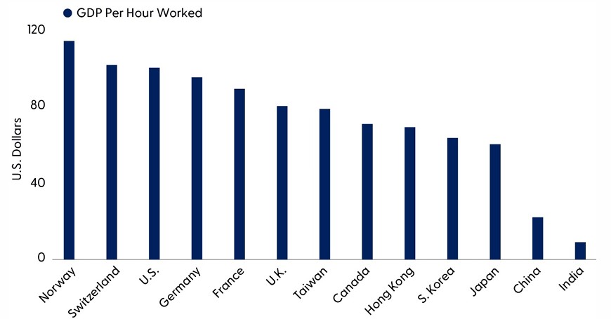 U.S. productivity outperforms other regions, such as in Europe, for a mix of structural, technological, and institutional reasons. One factor is the U.S. economy’s larger capital investment in advanced technologies, including software, computing, and AI. The U.S. devoted larger percentages of GDP to tech investment compared with the Eurozone, a difference that compounds over time as tech‑intensive firms scale faster. Larger capital investments in research and development (R&D) fuel innovation and diffusion of new production methods. European productivity growth has also been held back by deeper structural issues, such as weaker balance sheets and tighter credit constraints following the global financial crisis, which has slowed the reallocation of capital toward more productive businesses.